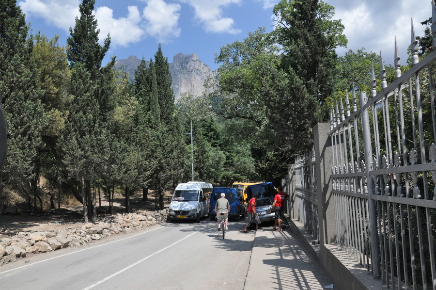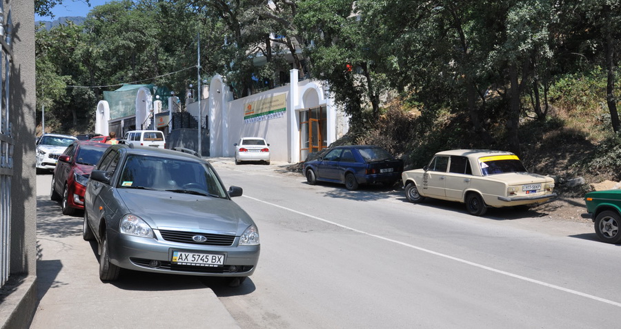 В указанном районе вдоль дороги припарковано множество автомобилей, транспортные средства расположены даже на тротуарах. В результате по нижней дороге, которая ведет также и к Воронцовскому дворцу, заблокирован проезд транспорта и движение пешеходов.