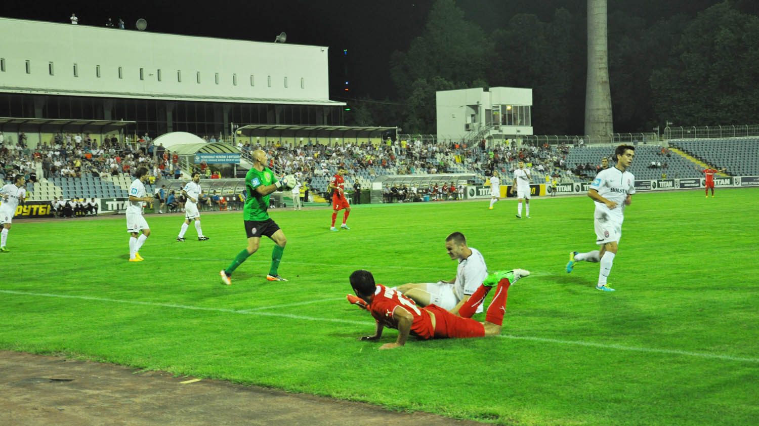 Первый мяч в ворота таврийцев влетел на 28-й минуте. После удара издали полузащитника «Зари» Дмитрия Хомченовского, мяч попал точно в левый угол ворот. Спустя 4 минуты симферопольцы могли сравнять счет, однако Марин Любичич не точно пробил головой метров с 10. Также симферопольцы растранжирили и другие потенциально опасные голевые моменты.