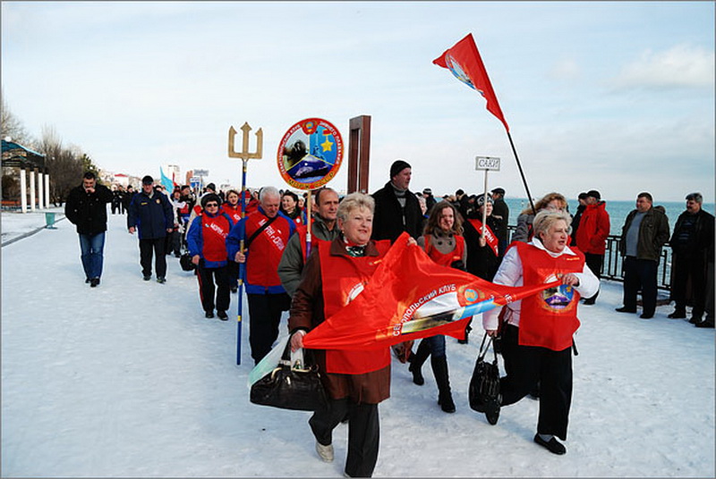 В рамках мероприятия «моржи» возложили цветы к памятнику воинам-интернационалистам, памятному знаку, посвященному Керченско-феодосийской десантной операции, а также прошли парадом по набережной.