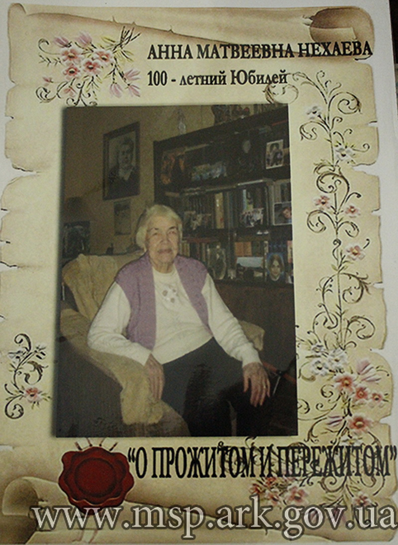 Поздравить именинницу Анну Нехаеву пришла начальник управления соцобслуживания и стационарных учреждений министерства Галина Сыромятникова. Она вручила поздравительный адрес от Президента Украины Виктора Януковича. В честь юбилея женщина получит 1 тыс. грн. из республиканского бюджета. «Сегодня в Крыму отмечают 100-летие сразу три юбиляра. Все они в хорошей форме. И каждый получит сегодня поздравления от Президента и такую же выплату», – сообщила представитель министерства.