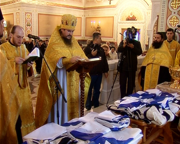 Сегодня в Севастополе во Владимирском соборе в Херсонесе прошло освящение Андреевских флагов.