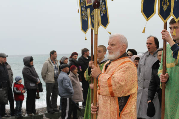 К традиционному крестному ходу прихожан Собора Александра Невского присоединились представители всех ялтинских церквей. Процессия во главе со священниками и казаками двинулась от собора Александра Невского по улицам Екатерининская и Чехова на набережную к часовне, где прошел праздничный молебен. Затем с пирса запустили в воду Крещенский крест.