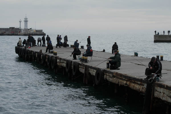 Гуляющие по набережной туристы покупают свежевыловленную рыбу. По словам рыбаков, кефаль, лифарь, ставридка и черноморская селедка клюют на голый крючок.