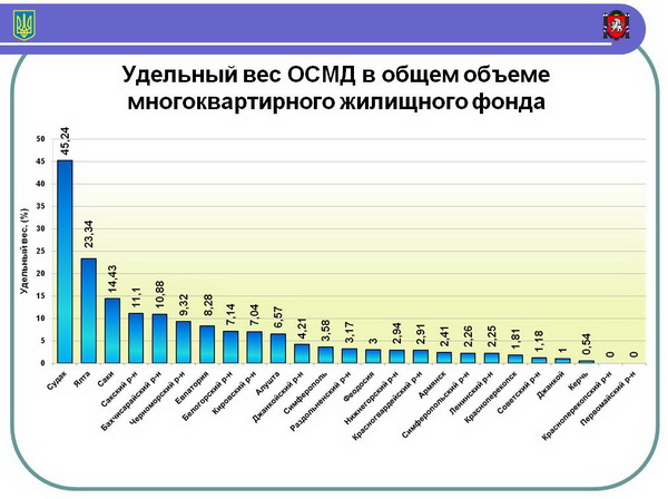 По состоянию на 1 января в общем объеме многоквартирного жилищного фонда доля ОСМД составляет 7,26%. Наибольший удельный вес ОСМД в Судаке (45,24%), Ялте (36,74%), Алуште (17,4%), Евпатории (10,7%). В Ялте создано 302 жилищных кондоминиума, в Алуште – 143, Евпатории – 88, Симферополе – 79, Феодосии – 34. В Сакском районе действует 31 объединение, в Кировском – 15, в Бахчисарайском – 13, в Черноморском – 11, в Симферопольском – 10, в Джанкойском – 8.