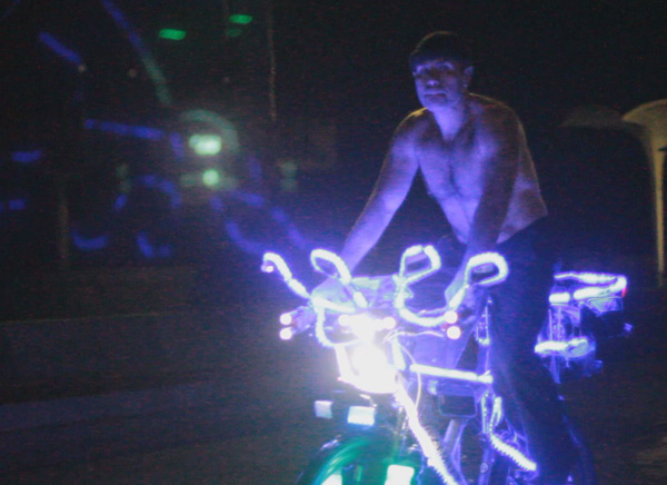 Мужчина средних лет с оголенным торсом на украшенном неоновой подсветкой велосипеде катается вдоль морского берега. На багажнике велосипеда установлен аудиодинамик, громко сообщающий о приближении самого велосипедиста популярной музыкой.