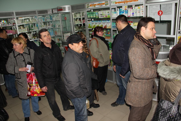 Участники акции выстроились в символичную очередь перед одной из аптек города, дабы подчеркнуть угрозу дефицита импортных лекарств, который может возникнуть после вступления закона в силу.