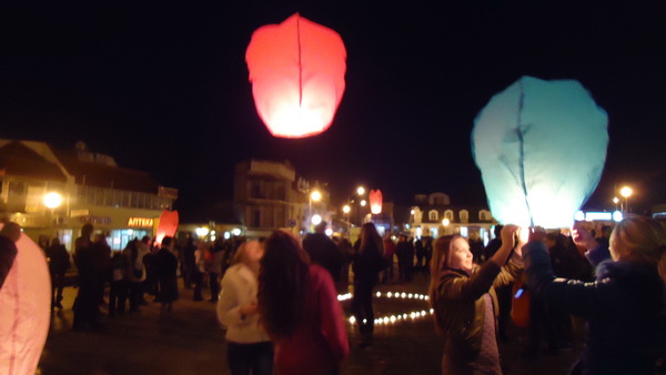 Молодежь города выложила на площади Ленина сердце из зажженных плавающих свечей. Потом каждая влюбленная пара зажгла и отправила в небо бумажный фонарик желаний, на котором предварительно молодые люди написали свои пожелания.