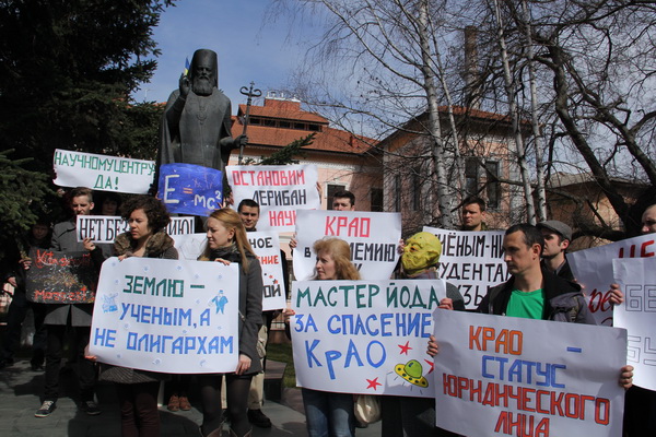 Ученых поддержали активисты общественной организации «Студенческое действие». Митингующие собрались у Представительства Президента в Крыму. «Мы собрались здесь потому, что наука в Украине умирает. При таком подходе не останется ничего, без науки нет будущего», – отметил ведущий научный сотрудник Крымской астрофизической обсерватории Юрий Цап.