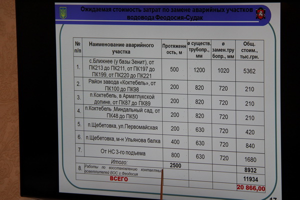Аварийные участки располагаются возле села Ближнее, поселков Коктебель и Щебетовка. Общая протяженность аварийных участков составляет 2,5 км. На реконструкцию водовода необходимо 8,9 млн. грн., а общая стоимость реконструкции с учетом проведения работ на очистных сооружениях составляет почти 20,9 млн. грн. Часть средств будет покрыта за счет предприятия «Вода Крыма», в которое входят все водоканалы Крыма, около 1 млн. грн. будет выделено из республиканского бюджета. Закончить реконструкцию планируется в мае.
