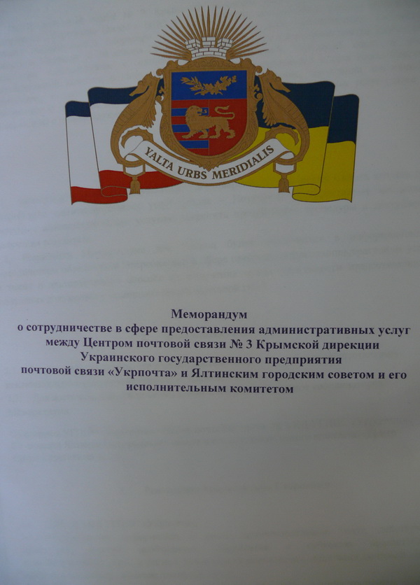 Ялтинские власти и местное отделение «Укрпочты» сегодня подписали Меморандум о сотрудничестве в сфере предоставления административных услуг, во исполнение которого пилотный проект запускается на базе отделения почтовой связи «Симеиз».