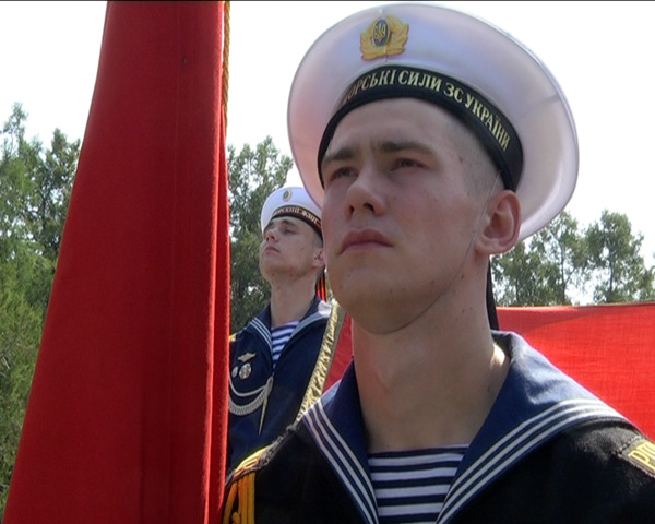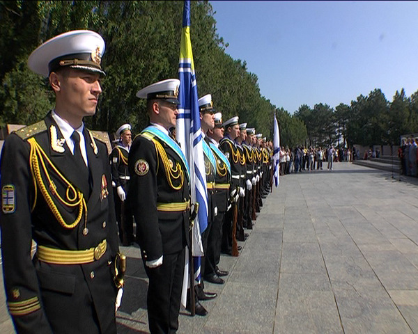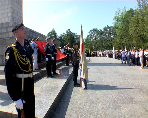 К Вечному огню почетный караул выносил знамена воинских частей и кораблей, защищавших и освобождавших город. Среди них – гюйс крейсера «Красный Кавказ», красное знамя 82-ой отдельной дальней разведывательной эскадрильи военно-воздушных сил Черноморского флота, гвардейский военно-морской флаг крейсера «Красный Крым», военно-морские флаги эсминцев «Бойкий» и «Бдительный» и флаг 331-го гаубичного полка.