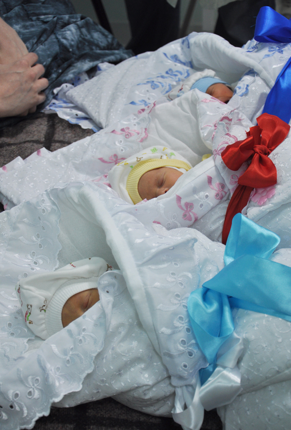 По словам 33-летней мамы – Нины Булгаковой из Керчи, дети родились при помощи кесарева сечения с разницей в минуту. Первым на свет появился Миша с весом 2,450 кг, вторая родилась девочка – Маша, она меньше на 100 грамм и весит 2,365 кг, и третий – Яков – весит 2,260 кг.