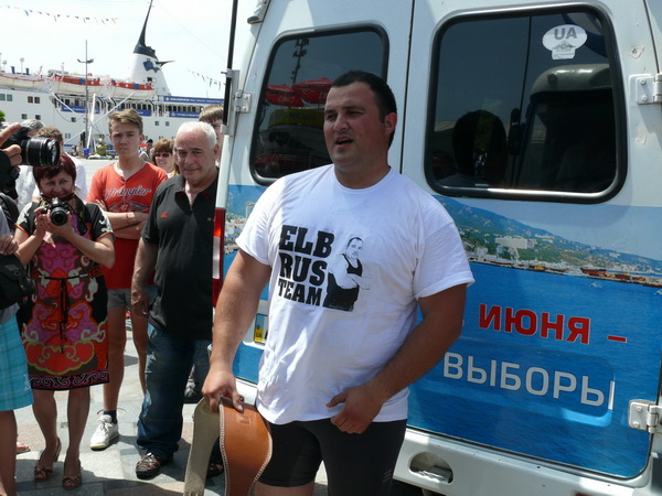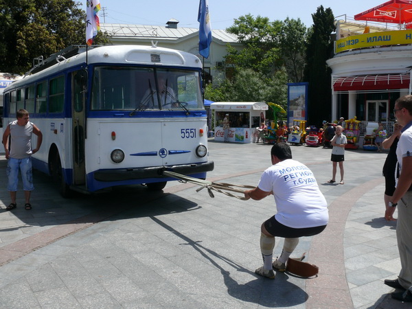 Силач из Судака «впрягся» в троллейбус и, двигаясь по натянутому тросу, протянул машину на расстояние десятка метров. По словам Джамшида Исматиллаева, тащить 10-тонную машину ему было несложно. «Я тренировался на огромном 18-тонном грузовике «SCANIA», да и занимаюсь я этим делом уже лет семь, а до этого увлекался тяжелой атлетикой», – поделился он.