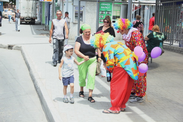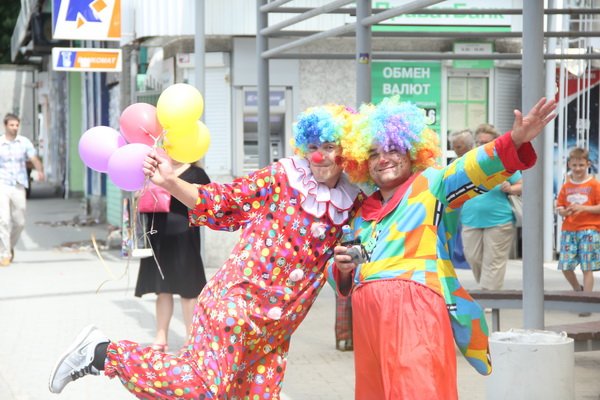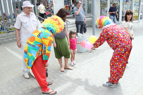 В Симферополе в районе автовокзала клоуны дарят детям воздушные шары и поздравляют с праздником.