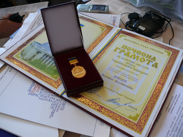 Среди прочих почетная грамота Верховной Рады Украины и нагрудный знак достались мэру Армянска Валентину Демидову. Награду вручил лично глава парламента страны Владимир Рыбак.
