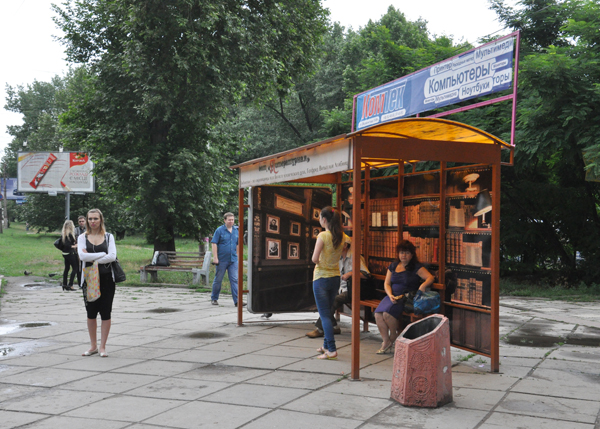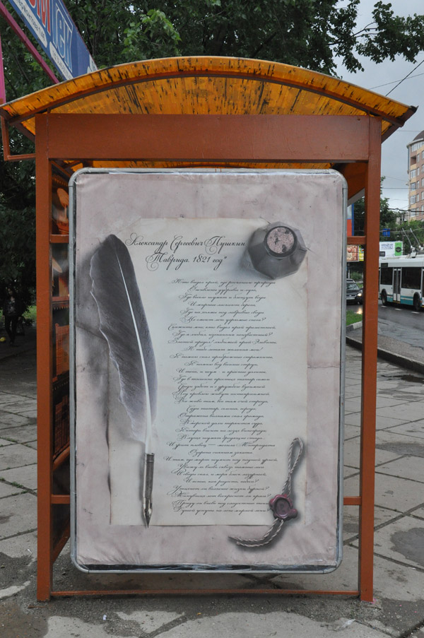 В Симферополе остановка по ул. Киевской возле Дворца культуры профсоюзов и Книжного рынка приобрела новый вид – на ней размещены стихотворения известных поэтов. Это четвертая арт-остановка, которая реализована Молодежным правительством при Председателе Совета министров АРК в рамках программы «Молодежь Крыма».