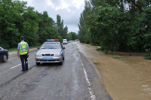 Сегодня в Белогорском районе возле села Черемисовка сильный разлив воды создал сложность движения по трассе «Симферополь – Феодосия».