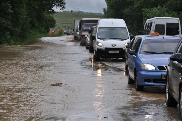 Вода доходит до середины колеса легкового автомобиля. Транспортная пробка в месте сложного проезда растянулась на 300-400 метров. На дороге дежурят инспекторы ГАИ.
