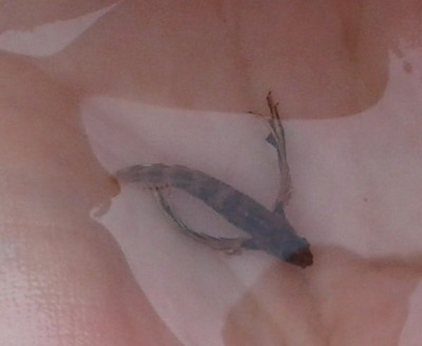 Размер рыбы составлял примерно 3 см, тело песочного цвета было покрыто более темными широкими поперечными полосами. Отличали рыбку очень длинные грудные плавники. Хвостовой плавник вертикальный, закругленный и почти прозрачный.