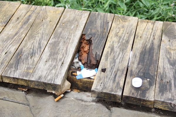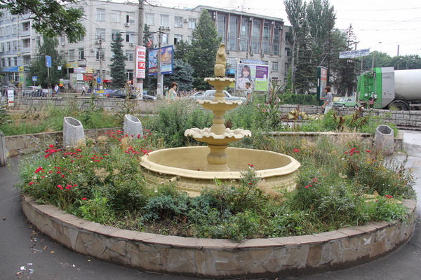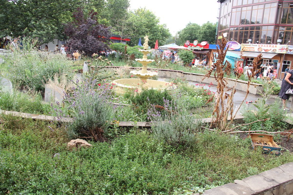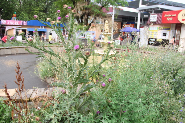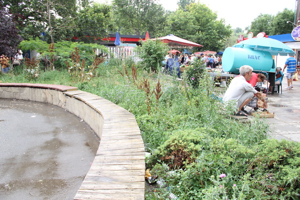 Облагороженная несколько лет назад площадь у рынка потеряла свой презентабельный вид. Клумбы заросли колючками и сорняками, под скамейками валяется мусор, сами скамейки поломаны. Фонтан, расположенный в центре композиции, не работает.