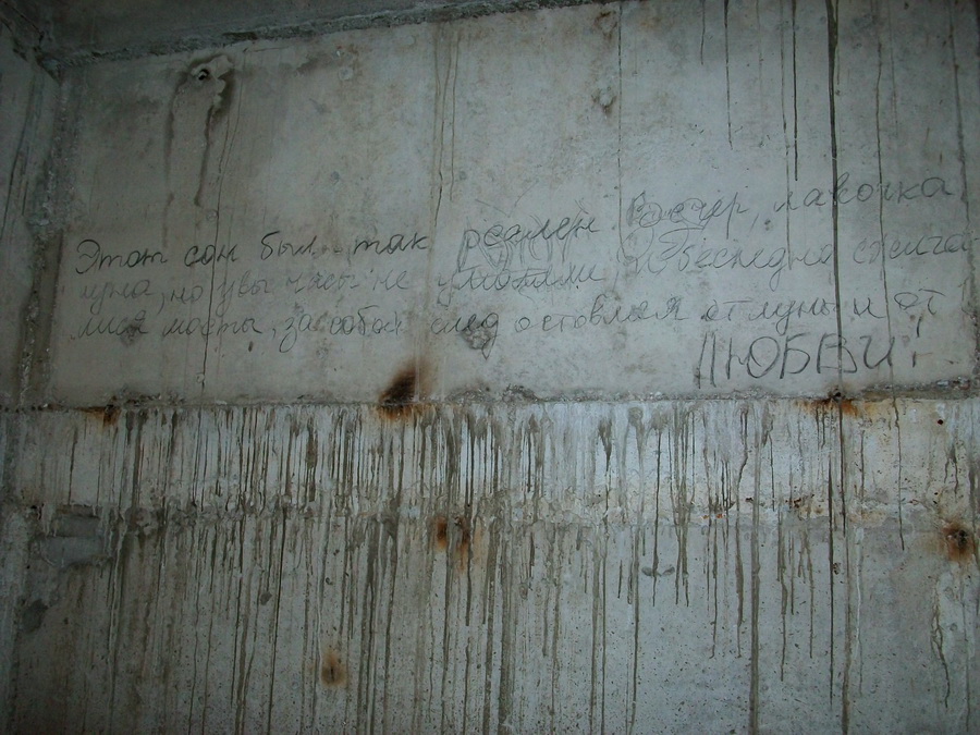 А еще меня всегда привлекали на «Утюге» надписи. Знаете, среди всего информационного потока, который сваливается на тебя здесь, можно найти настоящие «бриллианты». И тут важен не столько смысл написанного, само место играет большую роль. Так, в углу голой кирпичной комнаты видим надпись: «Улыбнись – завтра будет хуже!» А вот еще одна надпись. На стене темной комнаты написано по-украински «Ви не бачили». Чего-то или кого-то мы не видели...