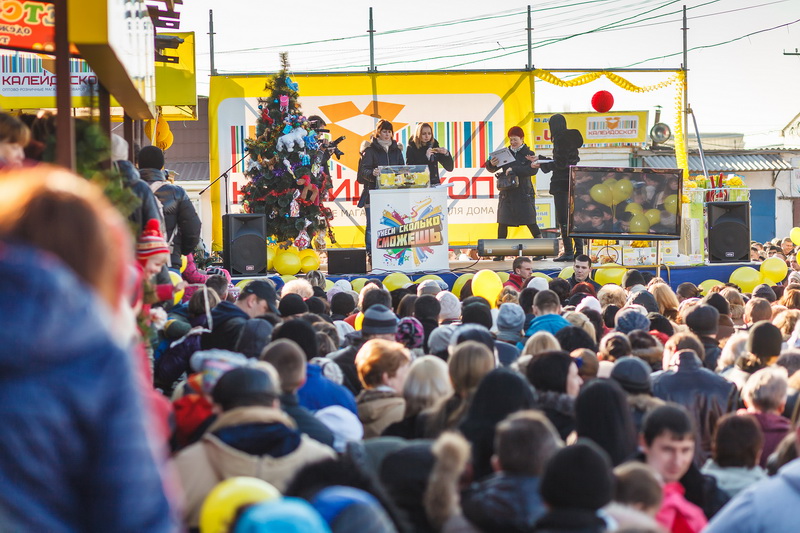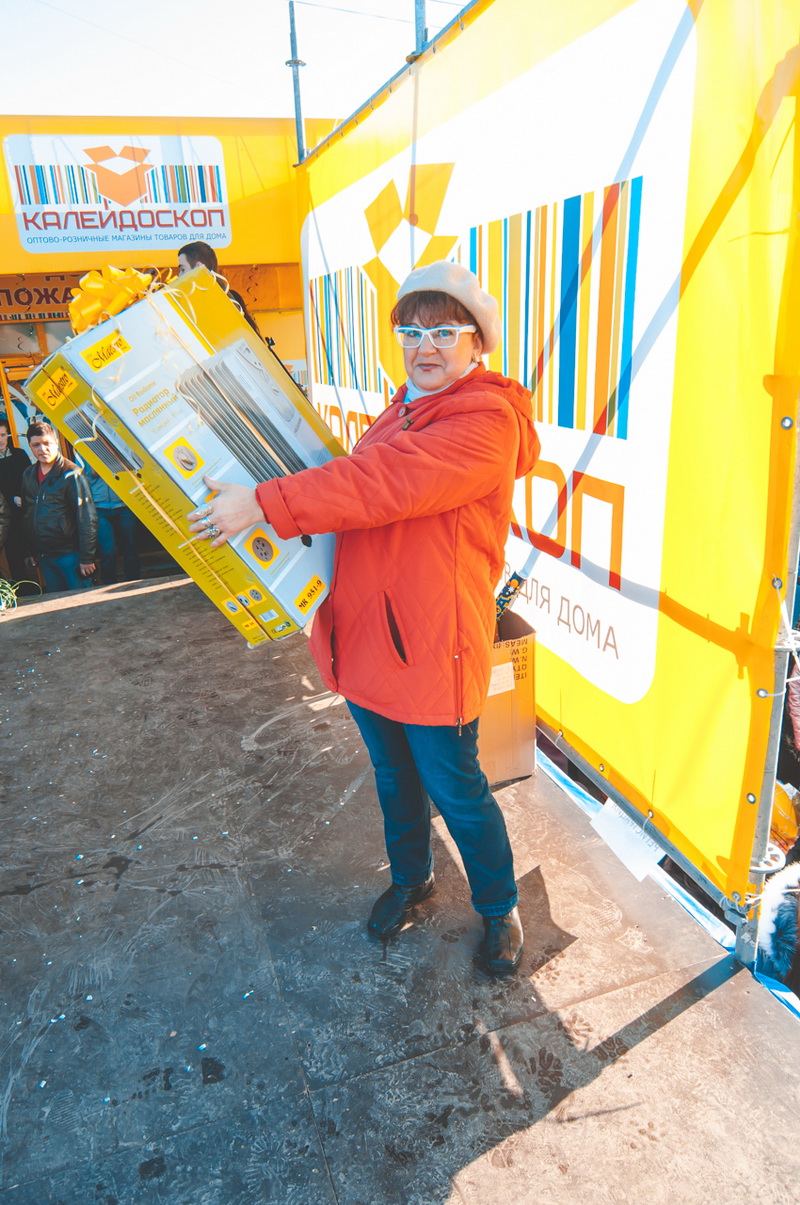 И вот последние секунды перед забегом. На старт, внимание, марш! Есть всего 60 секунд, чтобы без помощи подручных средств вынести из магазина «Калейдоскоп» любой товар! Зрители (они же болельщики) наблюдали за действием на большом экране, установленном перед сценой. Бегуна преследовал оператор, и в режиме реального времени картинка передавалась на экран. И вот минута закончилась, победительница покинула магазин. В руках – коробки с бытовой техникой и посудой. Товара удалось вынести на 598 гривен. Но счастья в глазах участницы явно на большую сумму.