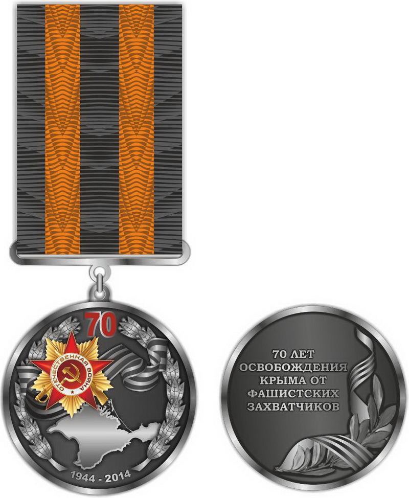 В частности, в окончательном варианте на лицевой стороне знака в нижней части изображена карта Крыма, над которой поместили георгиевскую ленту, под ней надпись «1944-2014».