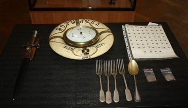 Предметы, среди которых 60 серебряных монет 17-18 века, коллекционные монеты Российской империи 1814 и 1818 годов выпуска, серебряная ложка, 4 мельхиоровые вилки дореволюционного образца и английский барометр конца 19 столетия, штык образца 1918 года, пытались вывезти контрабандой, они были задержаны работниками таможни.