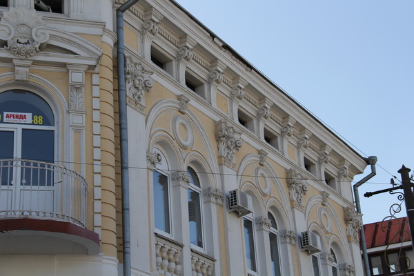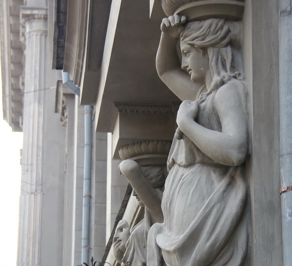 Наискосок от театра расположилось здание, которое дает богатую пищу для исследований – на его фасаде множество лепных элементов. Среди них можно увидеть бюсты девушек с обнаженной грудью и распущенными волосами. С одной стороны их можно назвать кариатидами – скульптуры на здании действительно служат продолжением колонн, но не полностью заменяют их. Но если приглядеться, то это не совсем девушки – вместо рук у них крылья, что дает богатую почву для размышлений. Образами девушек с обнаженной грудью и крыльями вместо рук пестрит древнегреческая мифология – это и сирены, губившие моряков своими сладкими песнями, и гарпии, похищавшие человеческие души. В славянской мифологии также есть представления о фантастических существах – девушках с крыльями вместо рук. Однако же в лепном варианте они не выглядят хищными чудовищами и вполне благообразны.