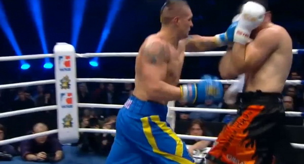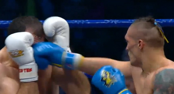 К рингу Александр Усик вышел с гетманской булавой и с именами детей на груди. В первом и втором раунде Александр Усик без труда получил очки за счет быстроты и маневренности, которые он умело использовал против соперника, превосходящего его по весу на 12 кг.