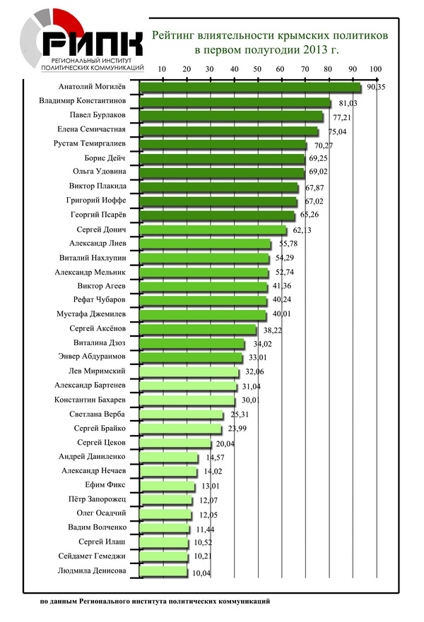 Председатель Совета министров Крыма Анатолий Могилев признан самым влиятельным политиком автономии. Об этом свидетельствуют результаты рейтинга по итогам первого полугодия 2013 года, проведенного Региональным институтом политических коммуникаций (РИПК).