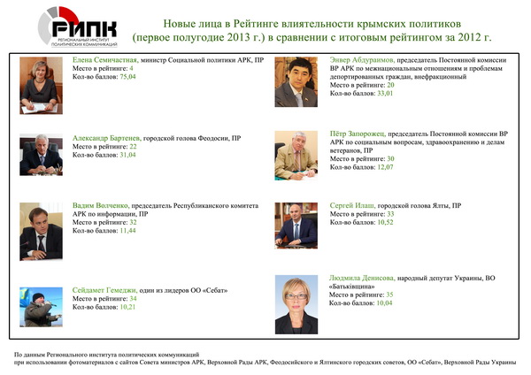 Анатолий Могилев получил 90,35 балла (из 100 возможных). Также в пятерку влиятельных политиков вошли Председатель Верховной Рады АРК Владимир Константинов (81,03 балла), первый заместитель главы Совмина Павел Бурлаков (77,21), министр социальной политики АРК Елена Семичастная (75,04), депутат Верховной Рады АРК Рустам Темиргалиев (70,27).